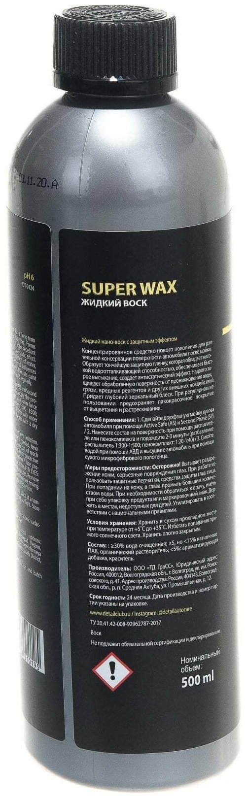 Type: liquid, concentrate, cold wax, foam wax, action: anti-static effect, water-repellent effect, fills small scratches, protects paintwork, protects against UV light, adds shine, speeds up the drying process