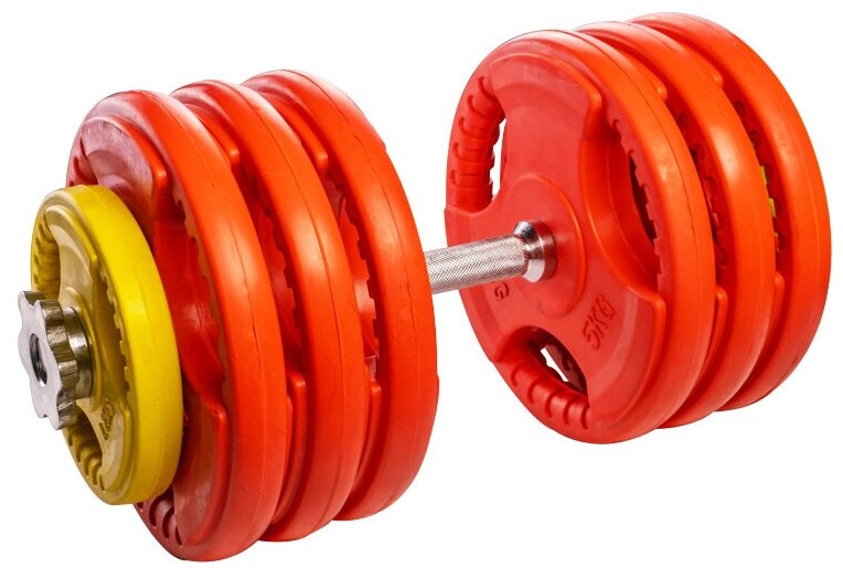 Type: dumbbell, design: collapsible, neck lock: nut, disc coating: rubber, handle coating: chrome