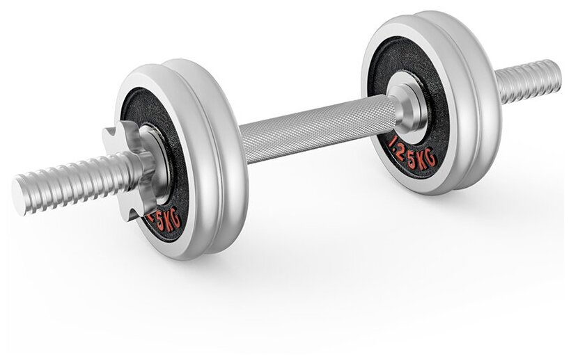 Type: dumbbell, design: collapsible, dumbbell shape: round, neck lock: nut, disc coating: chrome, handle coating: chrome