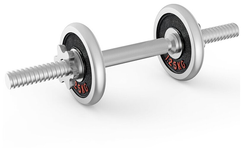 Type: dumbbell, design: collapsible, dumbbell shape: round, neck lock: nut, disc coating: chrome, handle coating: chrome