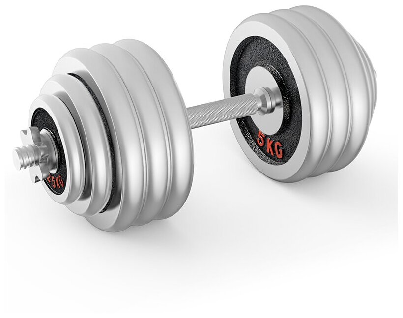 Type: dumbbell, design: collapsible, dumbbell shape: round, neck lock: nut, disc coating: chrome, handle coating: chrome