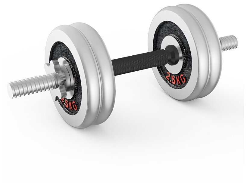 Type: dumbbell, design: collapsible, dumbbell shape: round, neck lock: nut, disc coating: chrome, handle coating: rubber