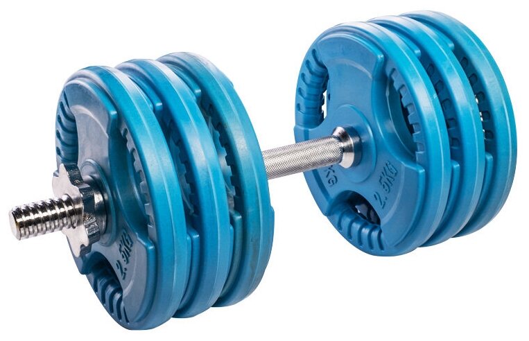 Type: dumbbell, design: collapsible, dumbbell shape: round, neck lock: nut, disc coating: rubber, handle coating: chrome