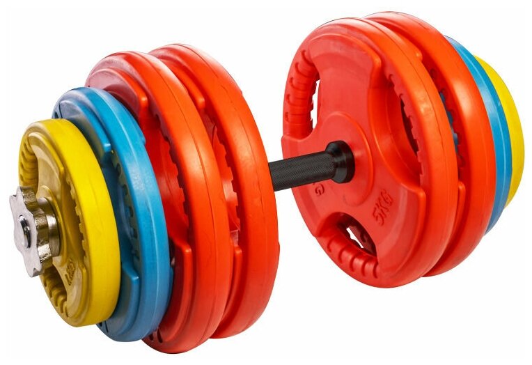 Type: dumbbell, design: collapsible, dumbbell shape: round, neck lock: nut, disc coating: rubber, handle coating: rubber