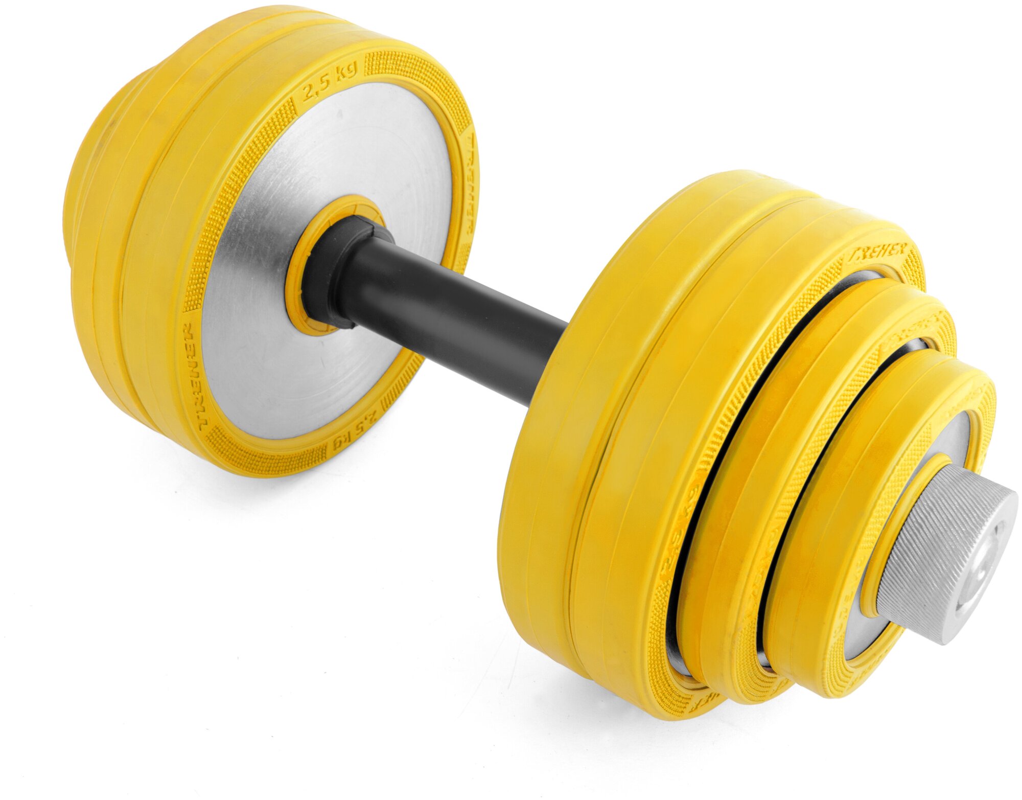 Type: dumbbell, design: collapsible, dumbbell shape: round, disc coating: rubber, handle coating: rubber