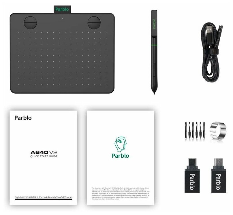 A640 V2, stylus, USB Type-C cable, replacement nibs 6 pcs, nib changer, user manual, warranty card, OTG adapter