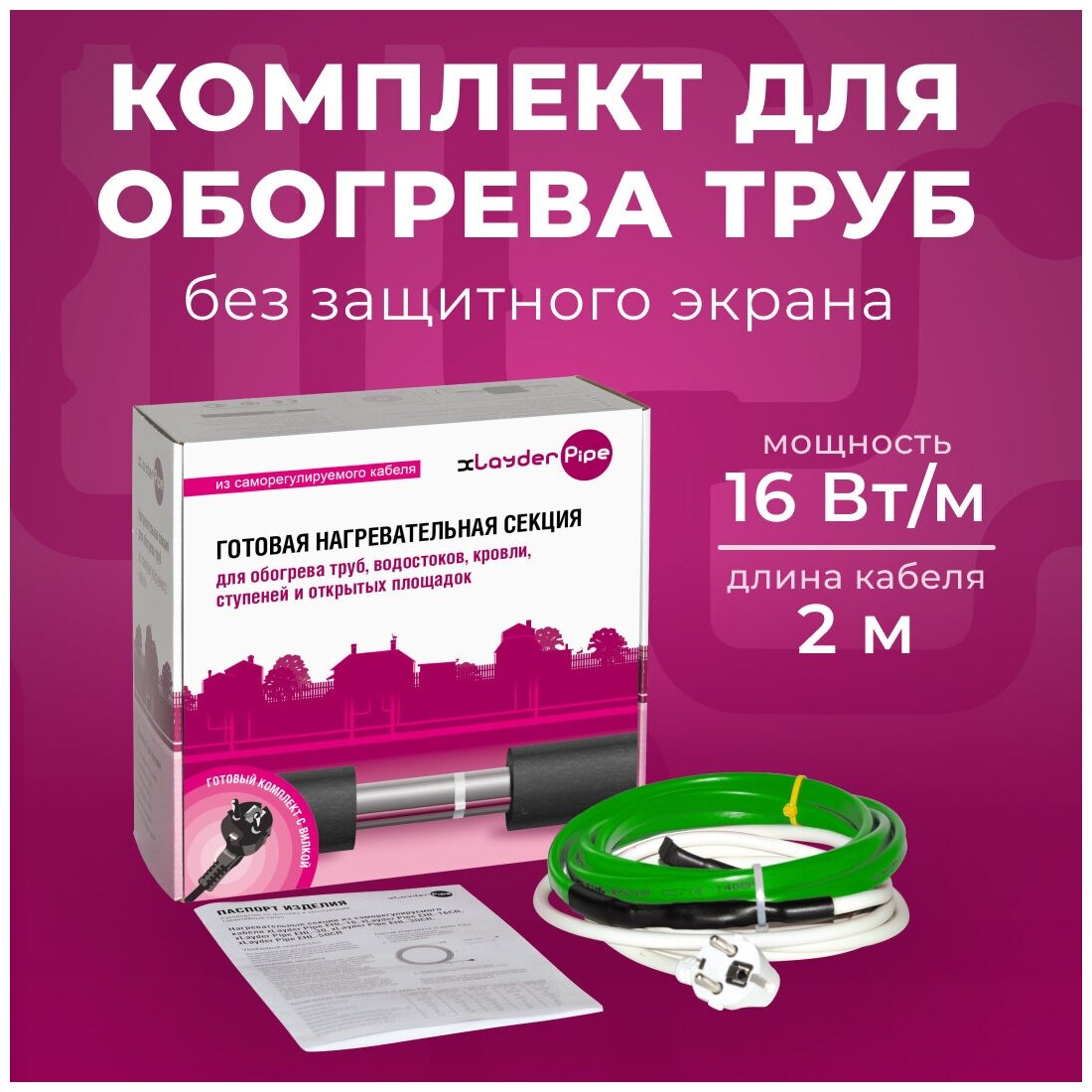 Type of cable: self-regulating, field of application: plumbing, drainage, sewerage, roofing, open area, pipeline, ready-made kit, installation: outdoor, type of accessory: plug, heating cable
