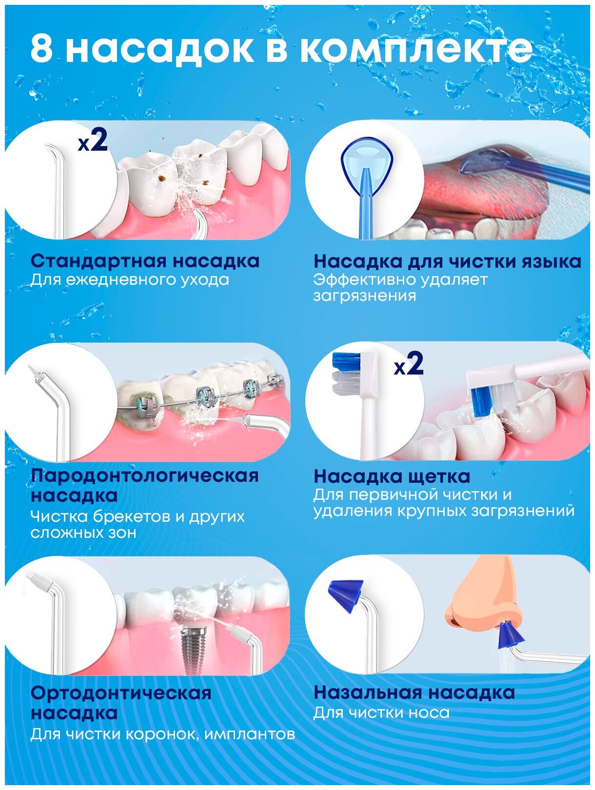 For jet cleaning, for cleaning implants and crowns, for cleaning the tongue, nasal, brush head, orthodontic for braces, periodontal for gums