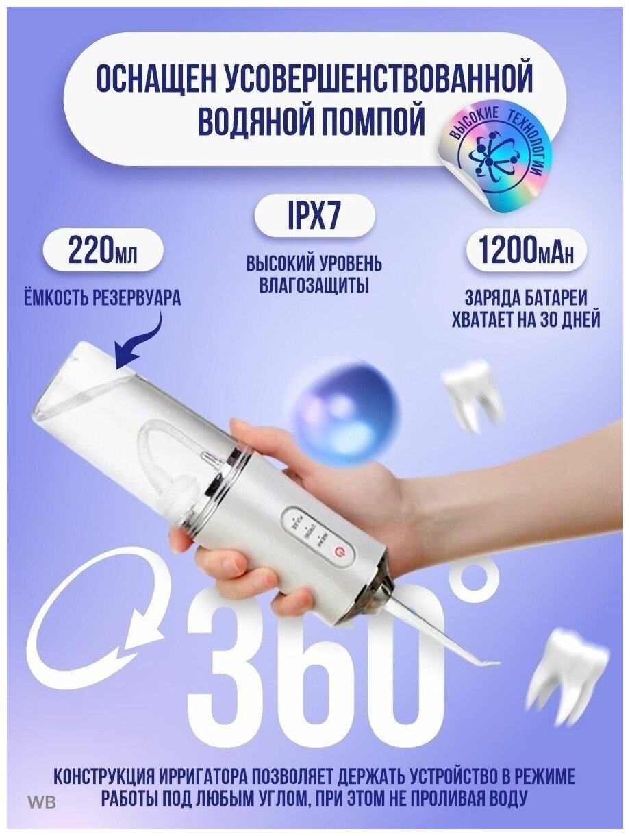 Power supply: battery powered, type: irrigator, principle of operation: impulse, nozzles: for jet cleaning, for tongue cleaning, orthodontic for braces, periodontal for gums, For the entire surface, For interdental pr