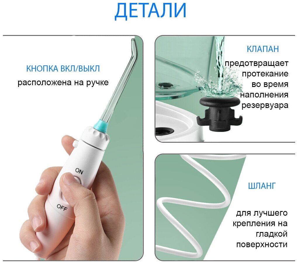 Powered: by battery, type: dental center, principle of operation: microbubble technology, nozzles: for jet cleaning, brush head, periodontal for gums, number of irrigator modes/adjustments: 3, modes: page
