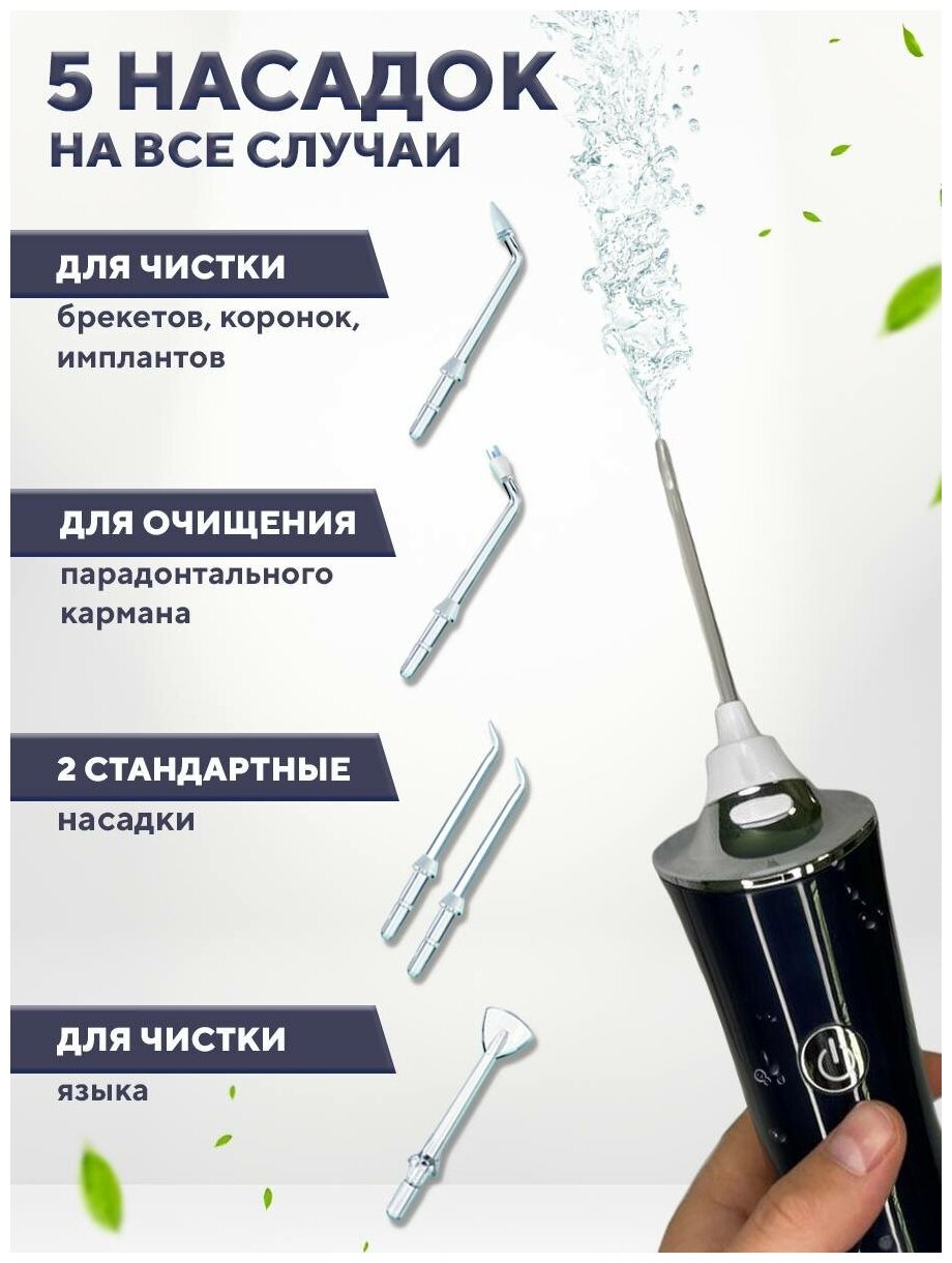 Power supply: battery powered, type: irrigator, principle of operation: impulse, nozzles: for jet cleaning, for cleaning implants and crowns, for cleaning the tongue, orthodontic for braces, periodontal for gums, container