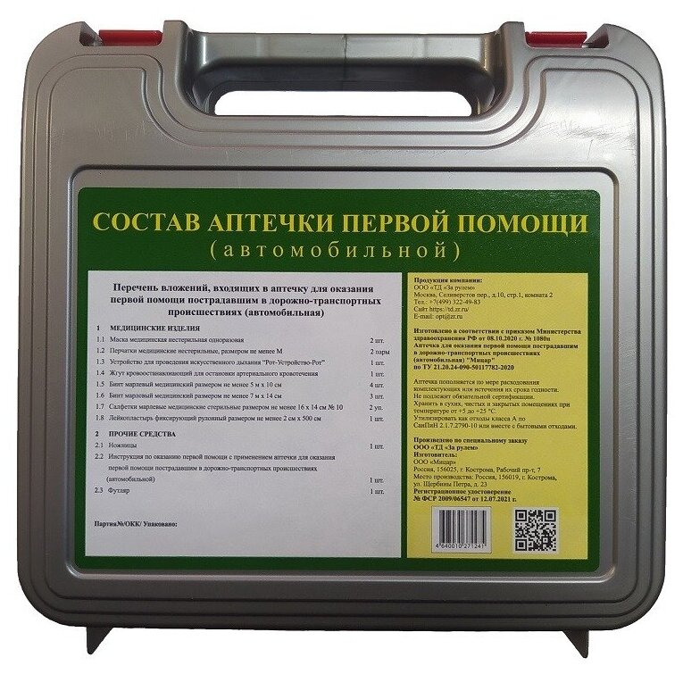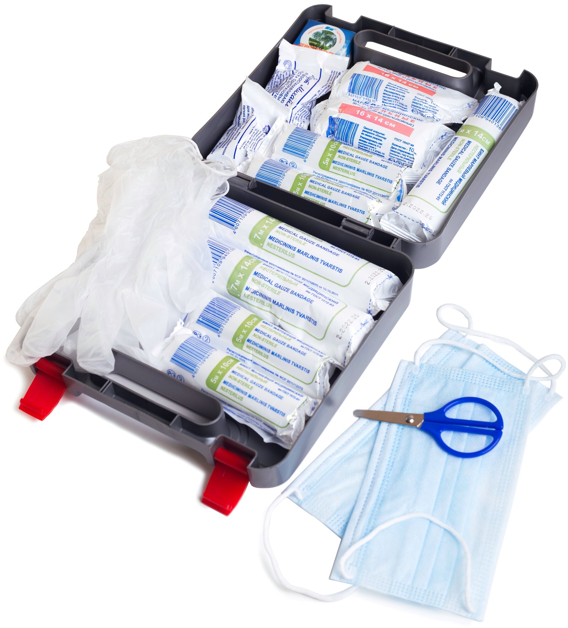 Non-sterile disposable medical mask - 2 pcs, non-sterile medical gloves, at least M-2 pairs in size, device for artificial respiration "Mouth-Device-Mouth" - 1 pc., hemostatic tourniquet to stop arterial bleeding - 1 pc., gauze bandage medical size not le