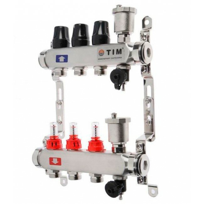 Pressure manifold with shut-off valves 1 pc., return manifold with thermostatic valves 1 pc., drain valves 2 pcs., automatic air vent 2 pcs., all-metal bracket 2 pcs., plugs 2 pcs.