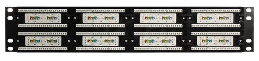 Number of ports/pin pairs: 48, 19" rack mount, unit height: 2U, cable category: CAT5e, cable type: unshielded, connectors: RJ-45 F, IDC pins, port labeling