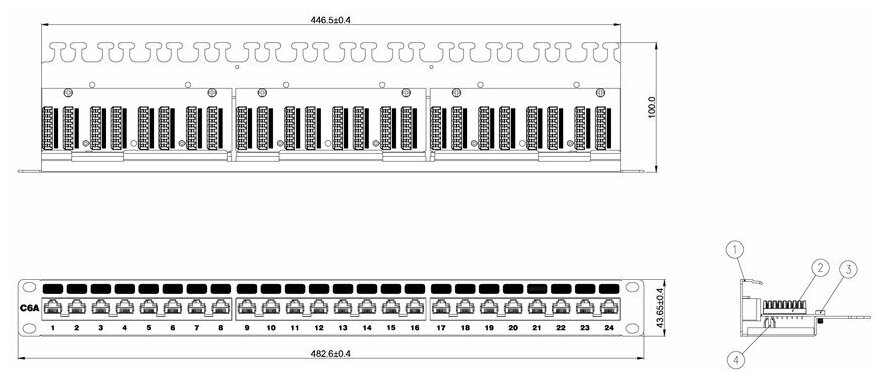 Number of ports/pairs of contacts: 24, installation in 19" rack, height in units: 1U, cable category: CAT6a, cable type: unshielded, connectors: RJ-45 F