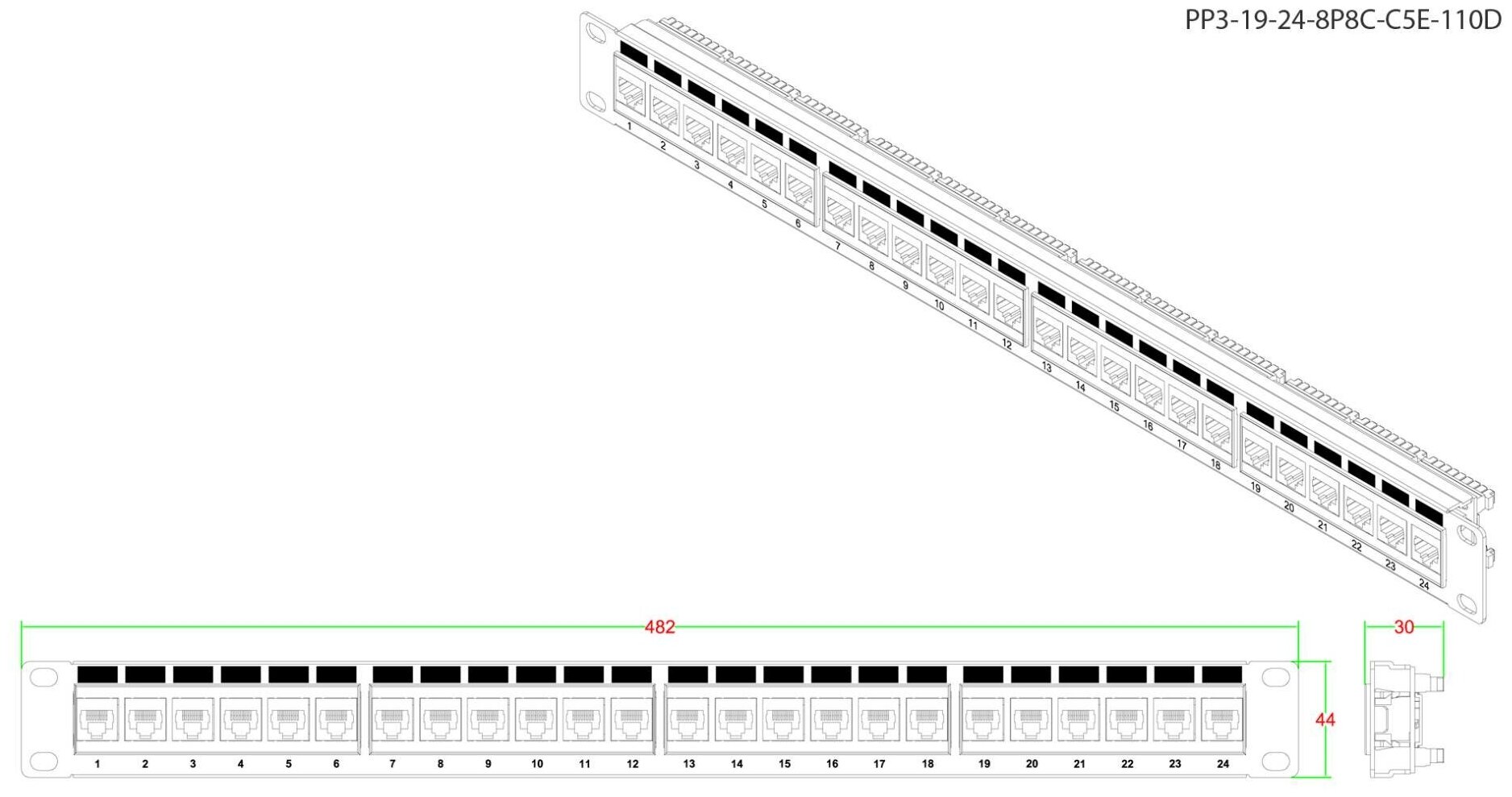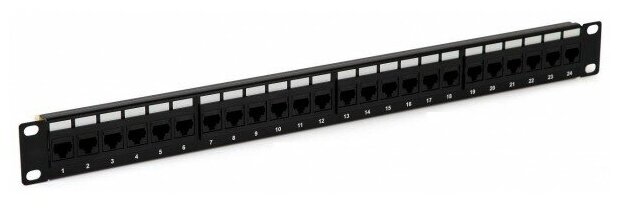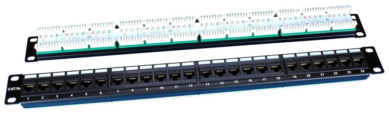 Number of ports/pin pairs: 24, installation in 19" rack, height in units: 1U, cable category: CAT5e, cable type: optical, connectors: RJ-45 F, RJ-45 F x 24, RJ45 F - 8P8C, marking ports, color-coded pins