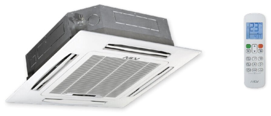Type: indoor unit, indoor unit type: cassette, inverter, additional modes: ventilation, night, dehumidification, features: decorative panel included, remote control, on/off timer