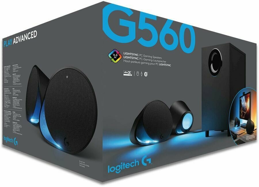 Two satellite speakers, one subwoofer with power cable, USB cable, user documentation; support for DTS X 7.1 Ultra decoder, LIGHTSYNC function lighting that reacts to events in games: Battlefield 1, Civilization VI, Counter Strike : GO, Discord, Dota 2