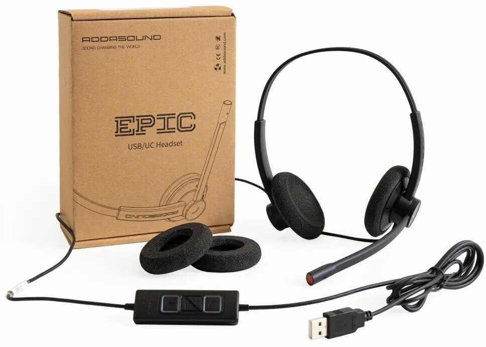 Headset with USB-A output, spare foam ear pads, instructions