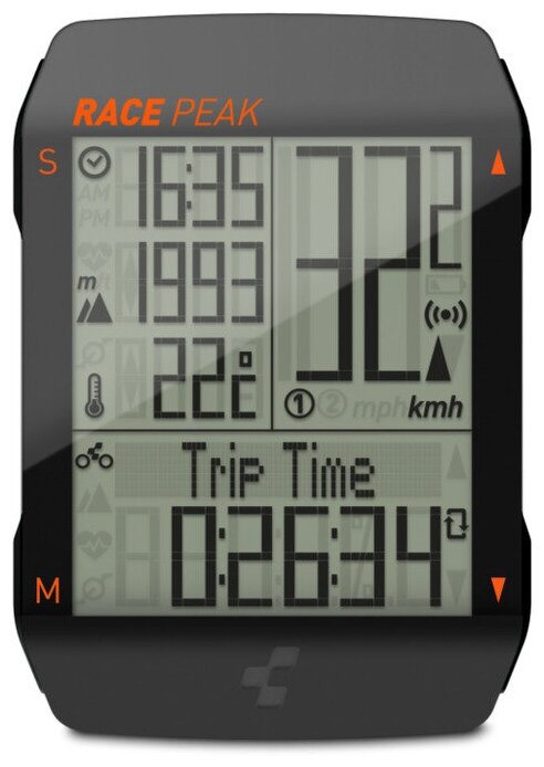 Automatic start/stop, training time, maximum altitude, maximum speed, total climb, odometer, single trip distance, stopwatch, average speed, current altitude, current speed, thermometer