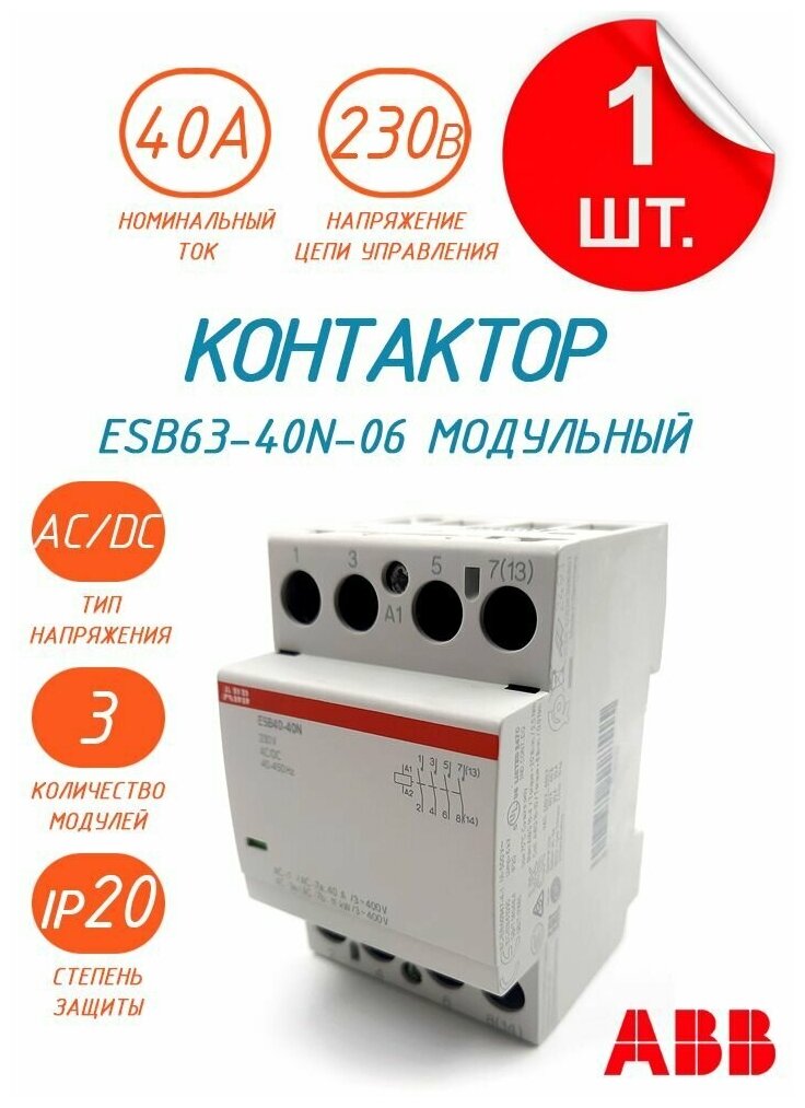 Type: modular contactor, rated operating current: 40 A, rated. slave. voltage min: 220 V, nominal. slave. voltage max: 400 V, control circuit voltage min: 230 V, Number of normally open NO contacts: 4, Number