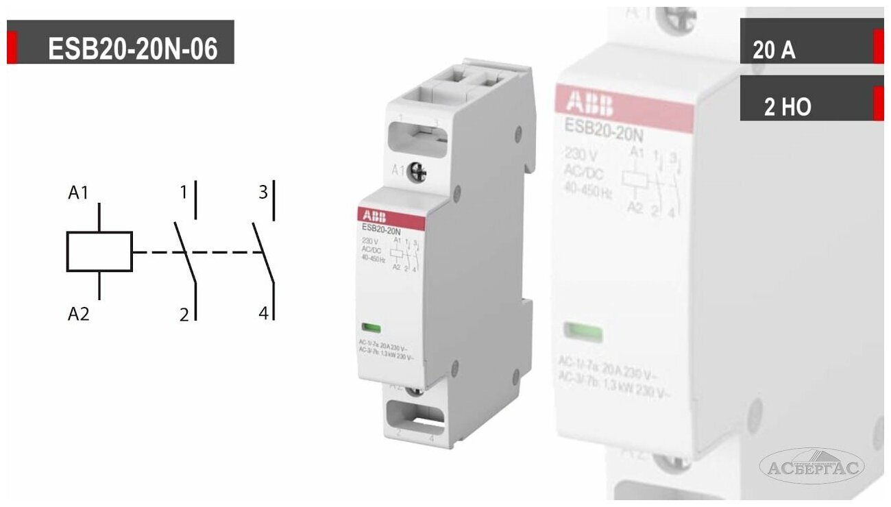 Type: modular contactor, rated operating current: 20 A, rated. slave. voltage min: 220 V, control circuit voltage min: 230 V, Number of normally open NO contacts: 2, operating voltage type. voltage: AC alternating