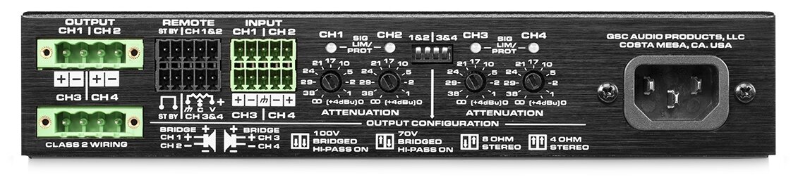 Power: 4x60 W 4/8 Ohm, 2x100 W bridge, 4/8 Ohm, 2x125 W bridge, 100 V; frequency range: 0.02-20 kHz; connectors: terminals: possibility of remote on/off; Included: IEC power cable, Quick Start Guide, kit