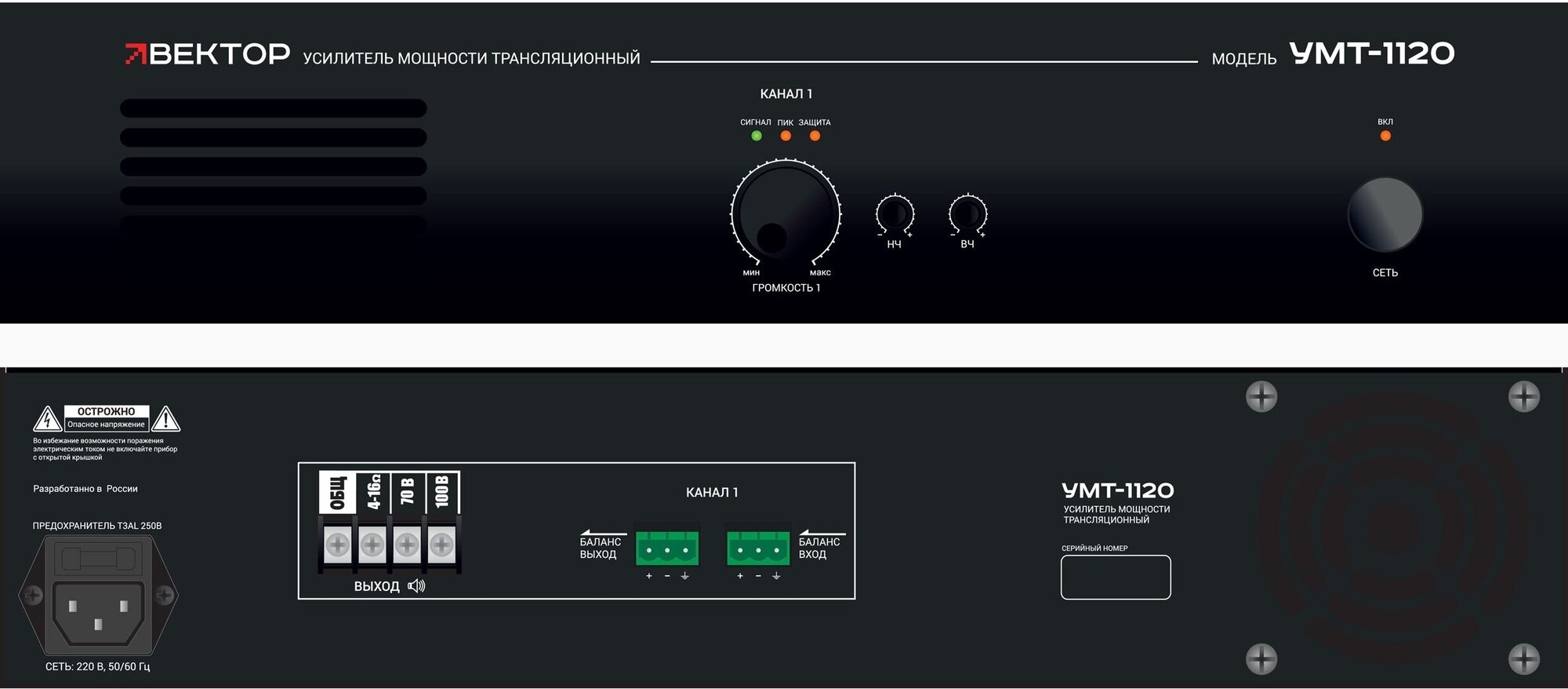 Indication of amplifier operating modes, output signal level adjustment, bass/HF adjustment, multi-stage protection, power supply 220-230 V/50-60 Hz