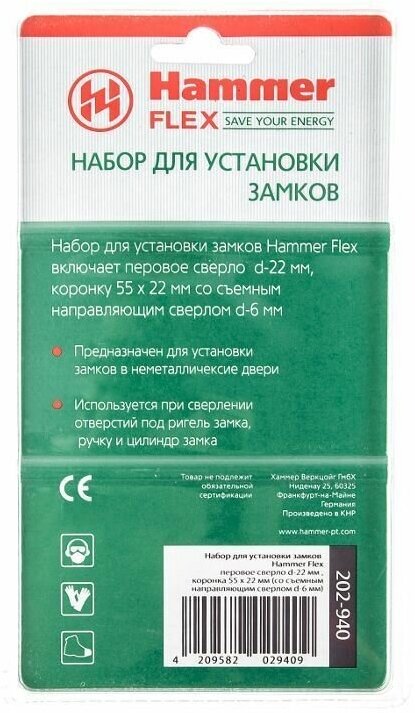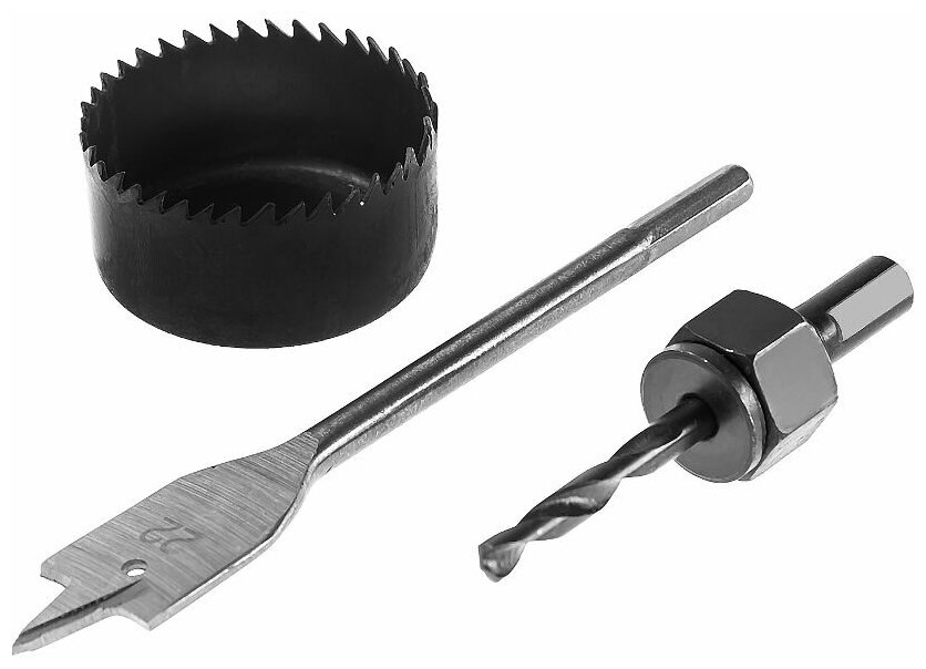 The set includes a feather drill d = 22 mm HEX shank, a core bit 55 mm x 22 mm with a removable guide drill d = 6 mm triangular shank