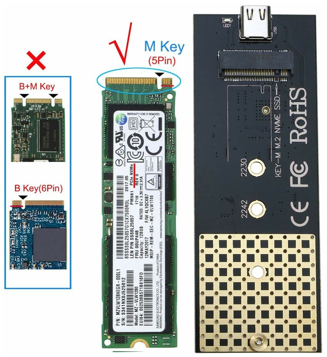 Board with JMS583 USB3.1 Gen2 chip Metal case with holes for passive cooling Type-C to USB cable Type-C to Type-C cable Screws for SSD mounting Thermal pad