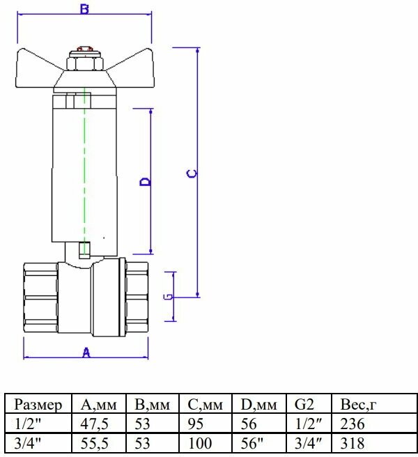 Type: straight, design: full bore, purpose: for water, control: butterfly handle