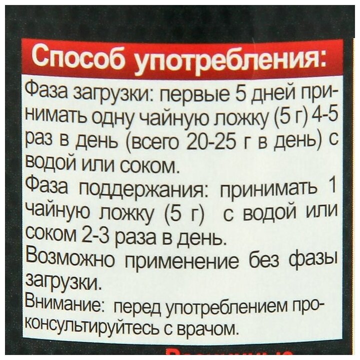 Recommendations for use: loading phase: for the first 5 days, take one teaspoon of 5 g with water or juice; maintenance phase: take 1 teaspoon 5 g with water or juice 2-3 times a day, can be used without loading phase