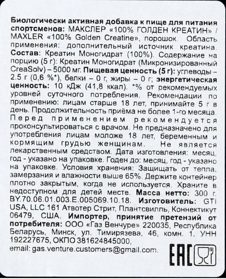 Recommendations for use: to obtain a serving, dilute 5 g of creatine, 1 scoop, in 200 ml of liquid; composition: creatine monohydrate
