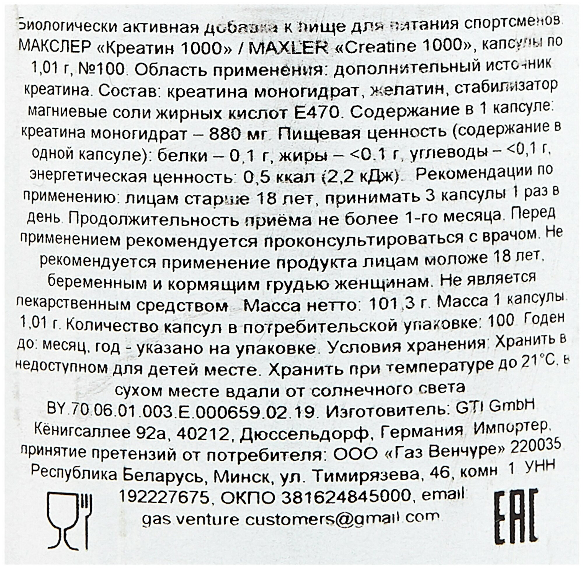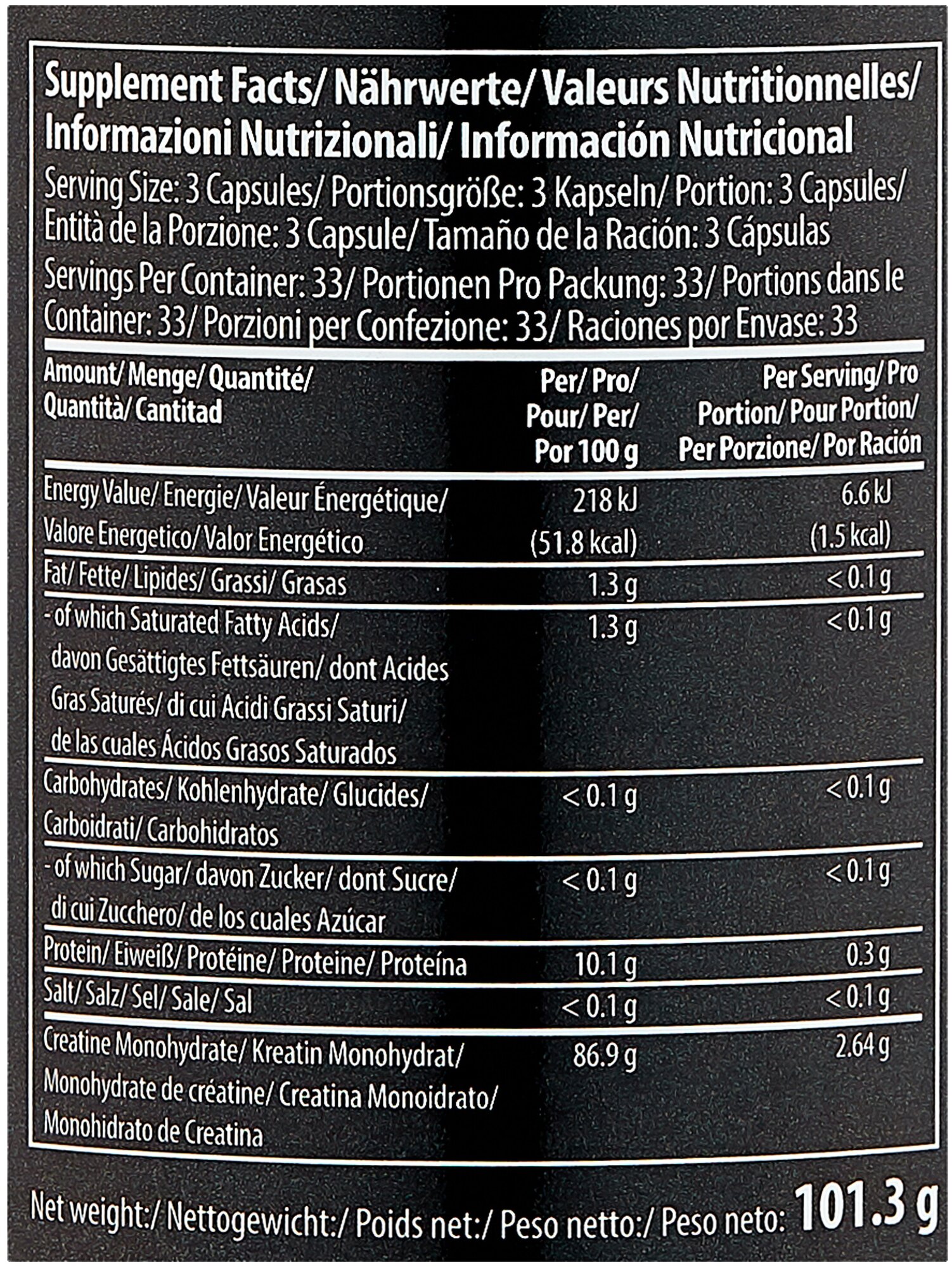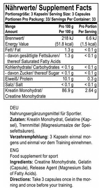 Serving size: 3 pcs.; Recommendations for use: take 1 serving of 3 capsules in the morning and 1 serving before training; composition: creatine monohydrate, gelatin, magnesium salts of fatty acids