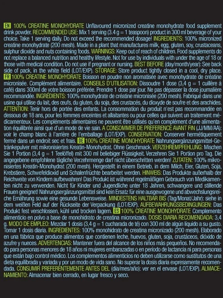 Additional Information: Recommendations for use: Mix 5 g of creatine monohydrate with 500 ml of any drink. Take 2 servings per day: one serving before and one serving after training.; composition: pharmaceutically pure creatine monohydrate