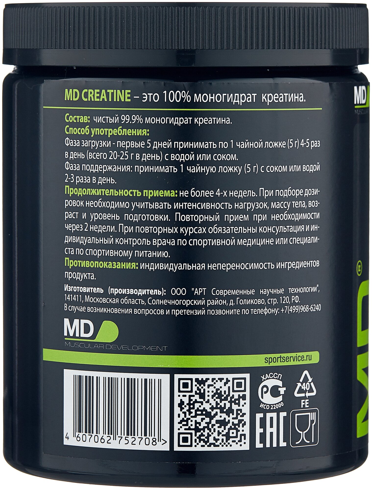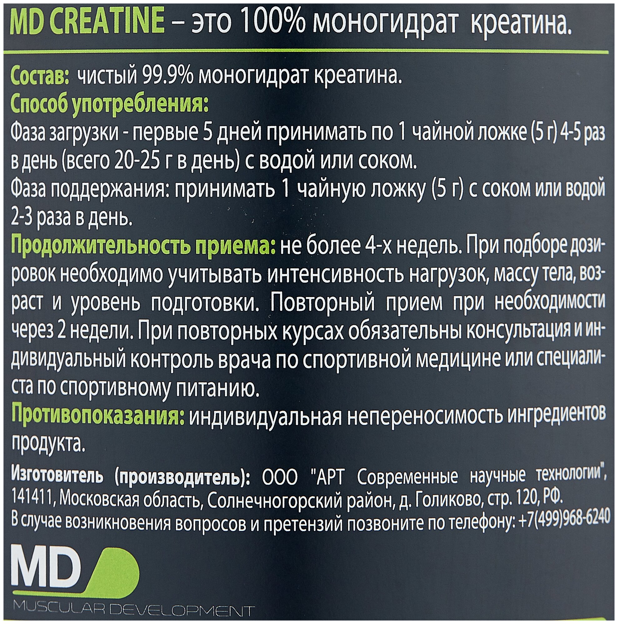Recommendations for use: loading phase - for the first 5 days, take 1 teaspoon 5 g 4-5 times a day, a total of 20-25 g per day with water or juice; composition: pure 99.9% creatine monohydrate