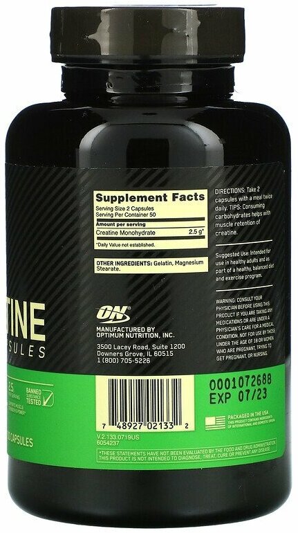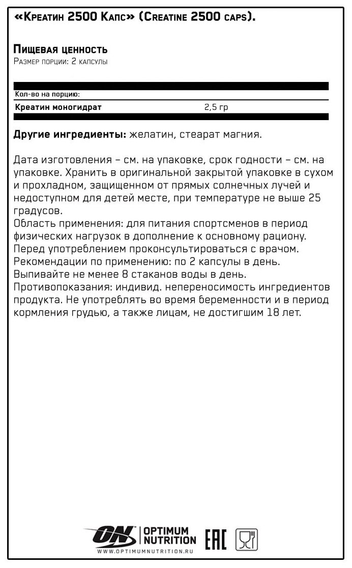 Additional Information: 2500 mg creatine monohydrate per serving; serving size: 2 pcs.; Recommendations for use: 2 capsules per day; drink at least 8 glasses of water a day; composition: creatine monohydrate, gelatin, magnesium stearate