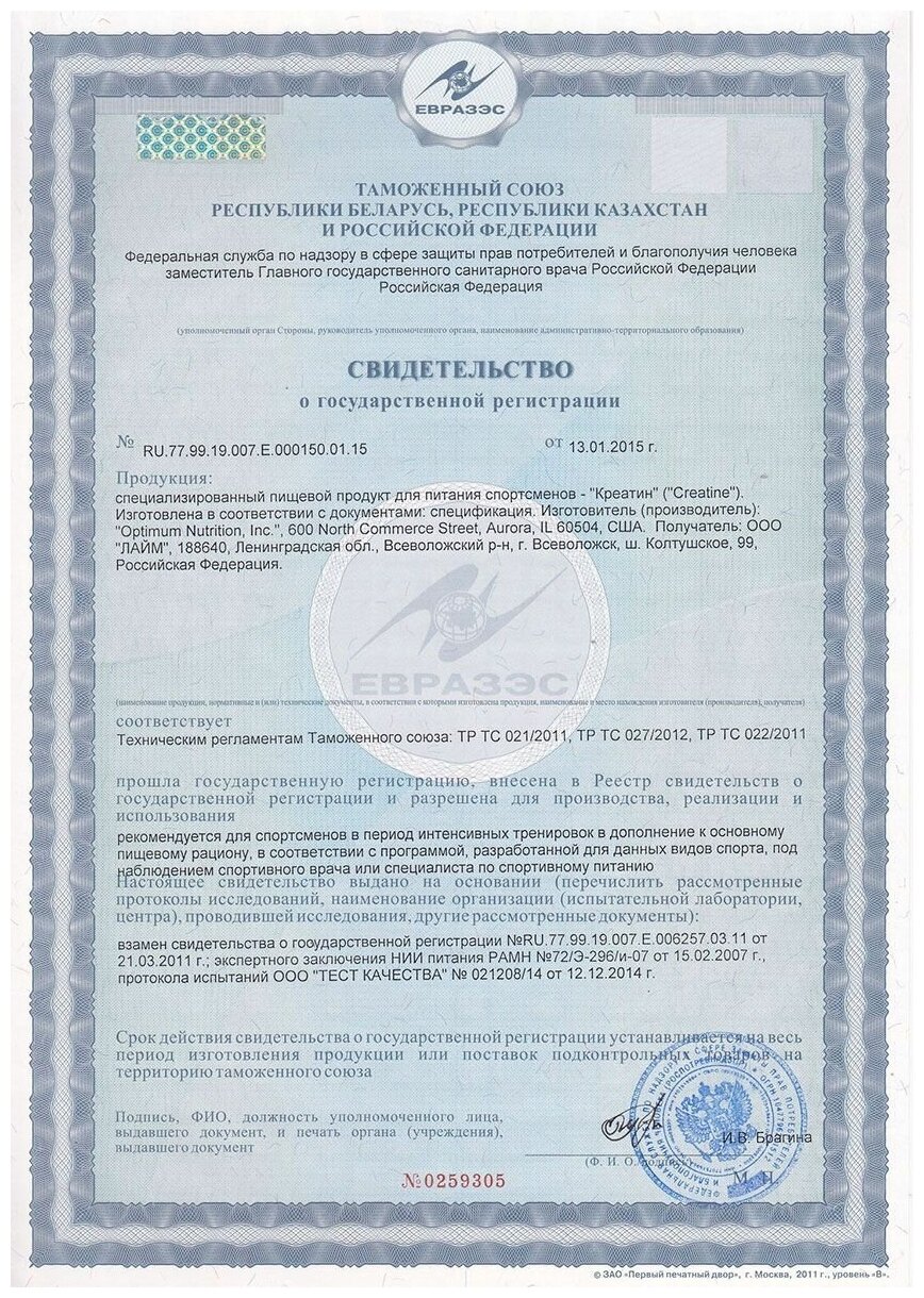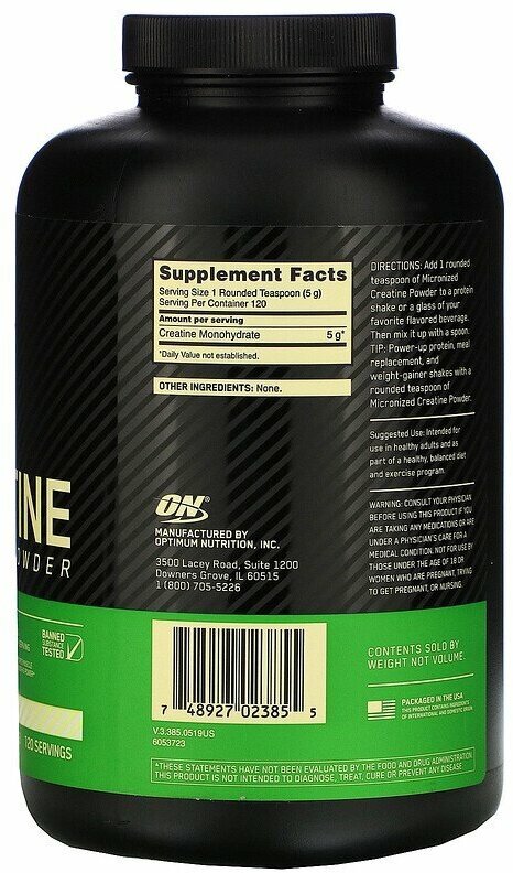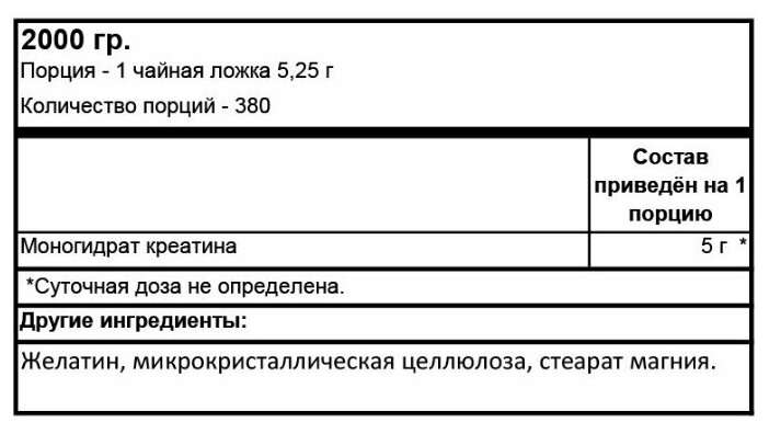 Additional Information: Recommendations for use: creatine loading phase - for the first 4-5 days, take 1 teaspoon 5 g, dissolved in 240-350 ml of water, during meals, 3-4 times a day; phase of maintaining creatine levels - take 1 teaspoon 5 g,