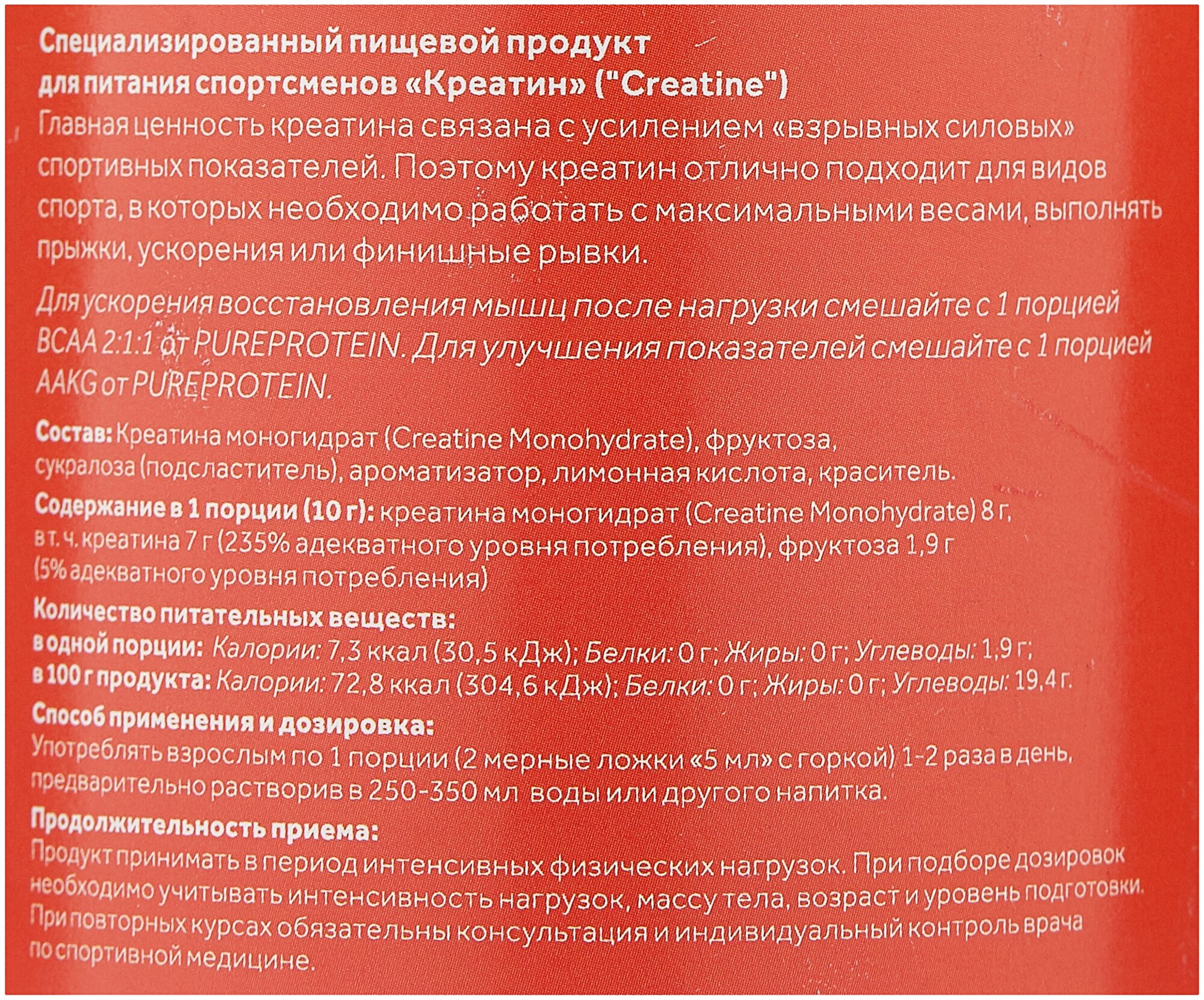 Recommendations for use: mix one serving of 2 scoops/10 g with 200-250 ml of water; composition: creatine monohydrate, fructose, citric acid, sucralose sweetener, flavorings, food coloring