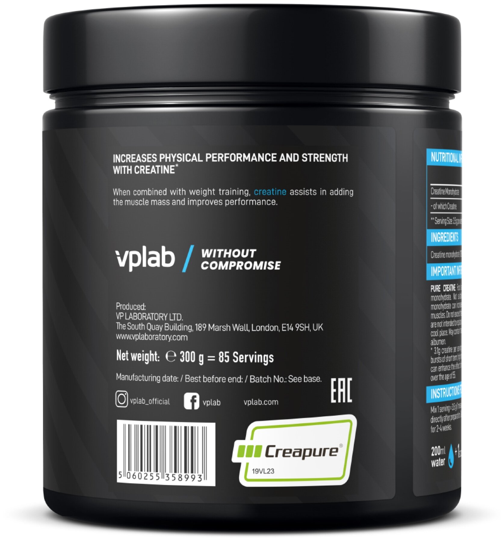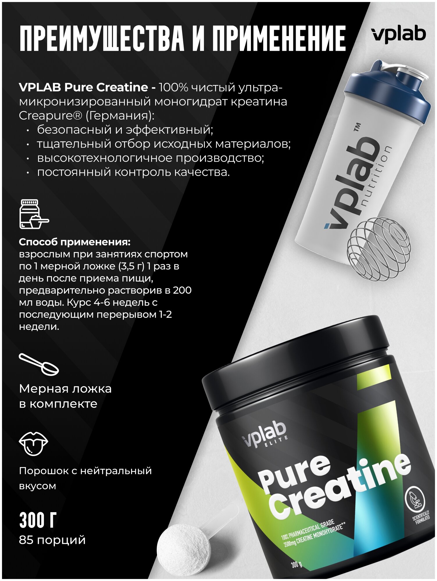 Additional Information: Recommendations for use: dissolve 1 scoop of 3.5 g of powder in 250 ml of water, take 1 serving per day for 6 weeks. Then take a break for 2-4 weeks; composition: 100% creatine monohydrate