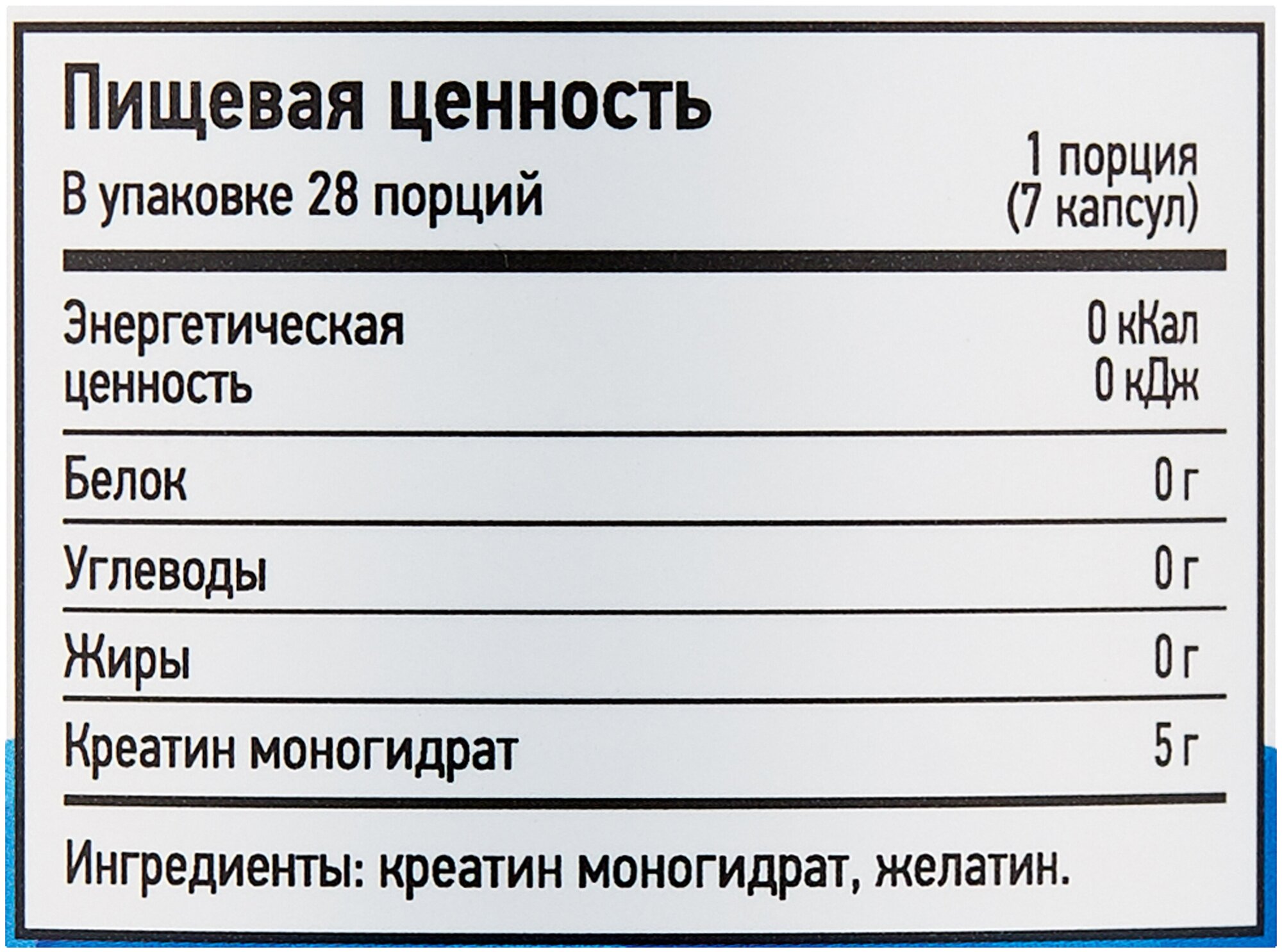 Release form: capsules/tablets, type: creatine, purity: pure, dietary features: aspartame-free, gluten-free, lactose-free, maltodextrin-free, sucralose-free, for whom: women, men