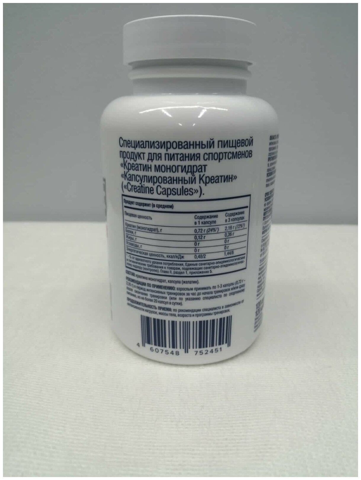 Per serving 2160 mg of creatine monohydrate; serving size: 3 pcs.; Recommendations for use: take 3 capsules per serving during intense training, an hour before the start of training and/or immediately after training.