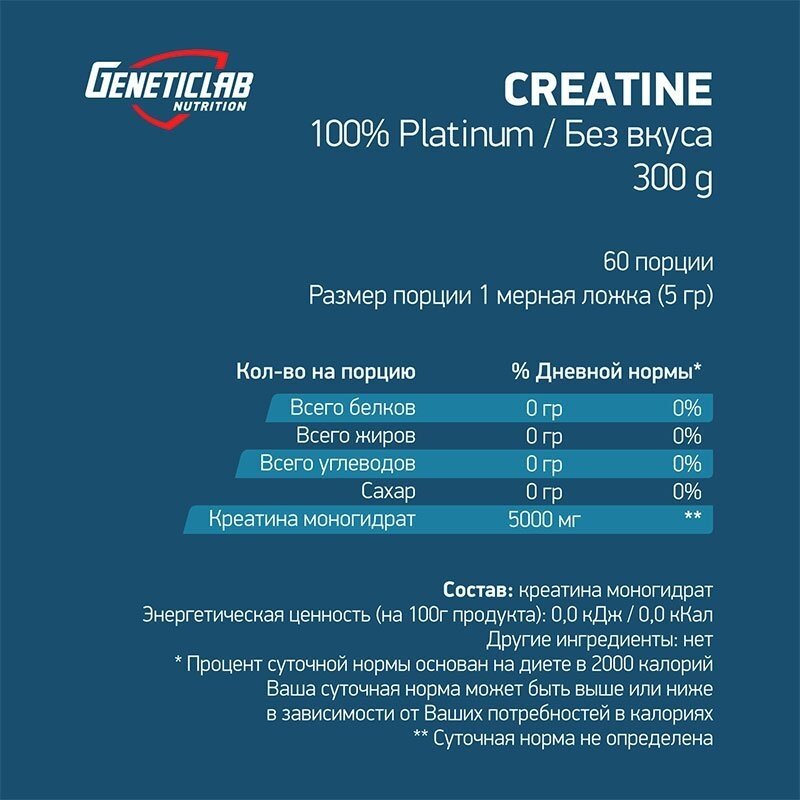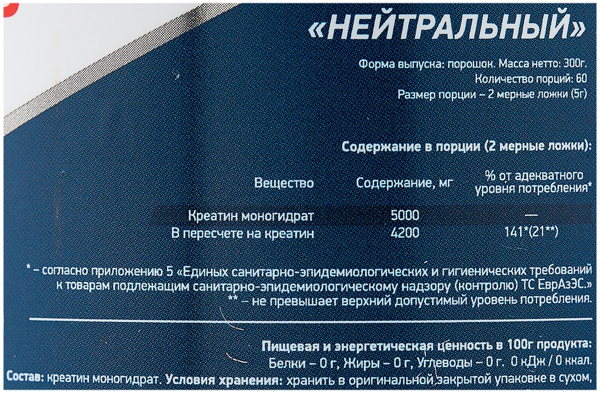 Content per serving: creatine monohydrate - 5000 mg in terms of creatine - 4200 mg; Directions for use: Serving size: 2 scoops 5 g; composition: creatine monohydrate