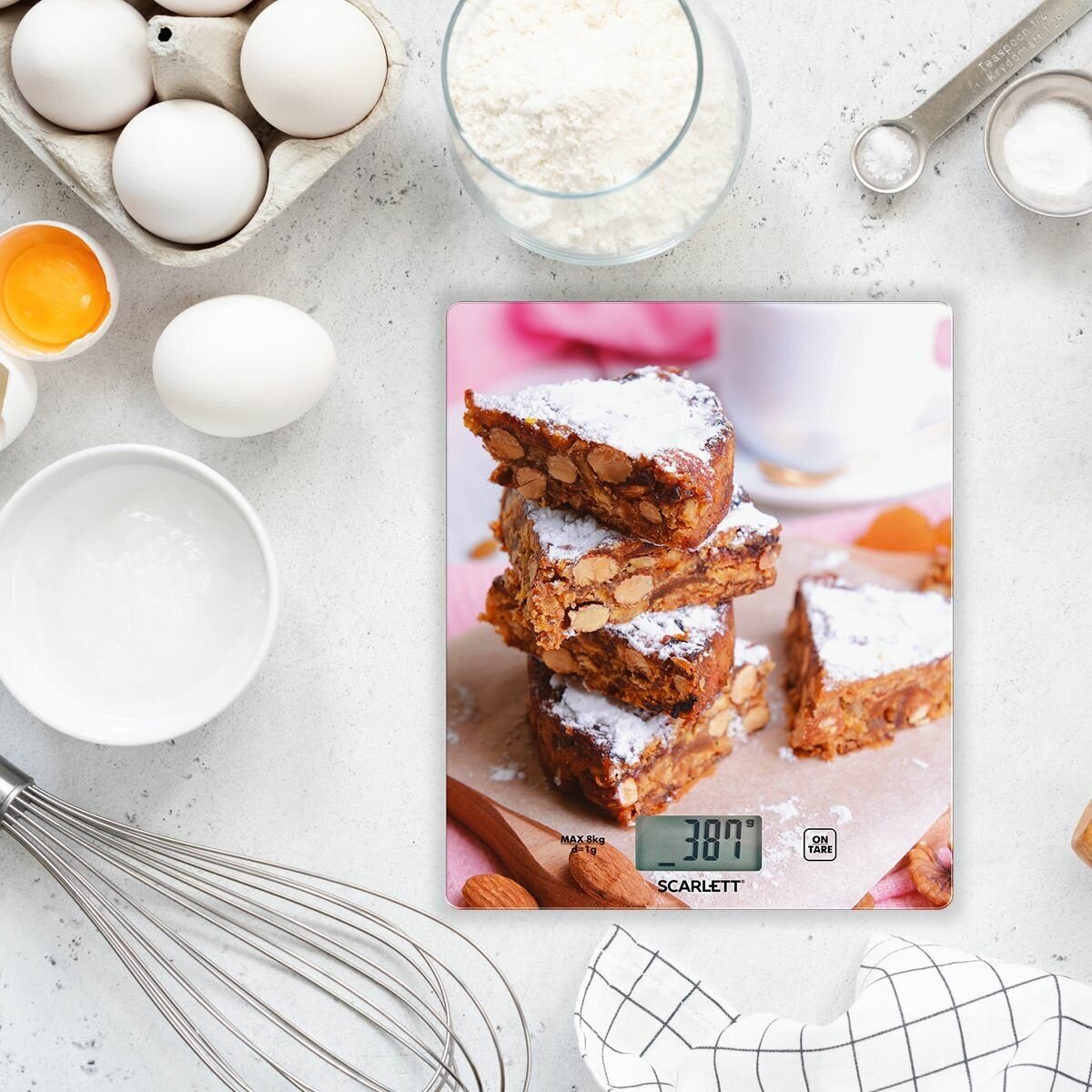 Type: electronic, design: platform, weighing limit: 8 kg, measurement accuracy: 1 g, additional functions: automatic shutdown, liquid volume measurement, tare compensation, indication: battery charge, switch