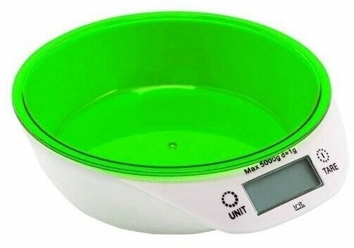 Type: electronic, design: bowl, weighing limit: 5 kg, measurement accuracy: 1 g, additional functions: automatic shutdown, indication: battery charge, overload