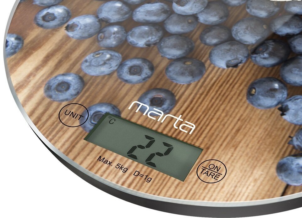 Type: electronic, design: platform, weighing limit: 8 kg, measurement accuracy: 1 g, additional functions: automatic shutdown, liquid volume measurement, tare compensation, indication: battery charge, switch