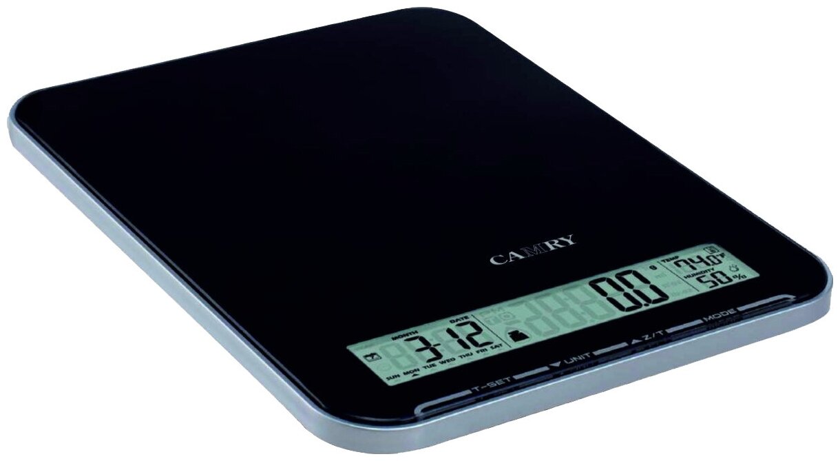 Type: electronic, design: platform, weighing limit: 10 kg, measurement accuracy: 1 g, additional functions: liquid volume measurement, timer, tare compensation, clock