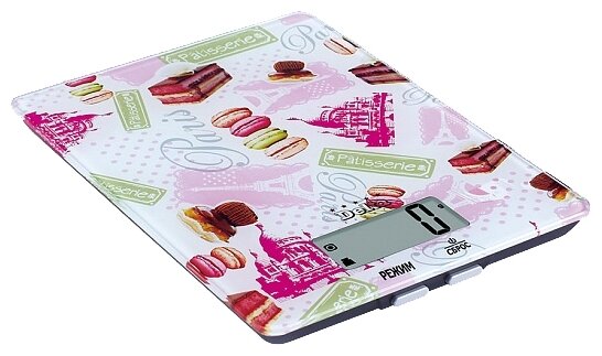 Type: electronic, design: platform, weighing limit: 8 kg, measurement accuracy: 1 g, additional functions: automatic shutdown, liquid volume measurement, tare compensation, indication: battery charge, switch