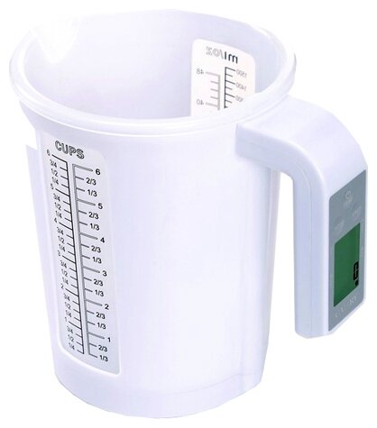 Type: electronic, design: bowl, weighing limit: 5 kg, measurement accuracy: 1 g, additional functions: liquid volume measurement, tare compensation, indication: battery charge, overload
