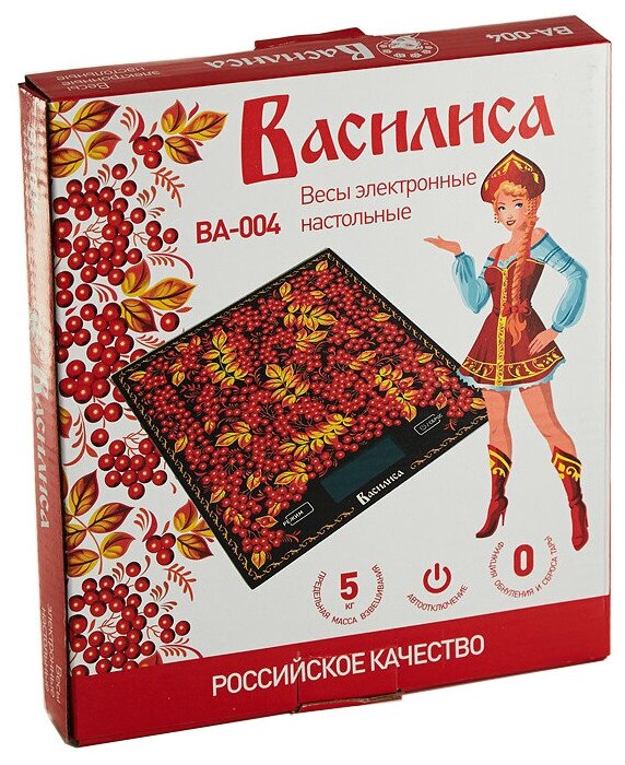 Type: electronic, design: platform, weighing limit: 8 kg, measurement accuracy: 1 g, additional functions: automatic shutdown, liquid volume measurement, tare compensation, indication: battery charge, switch